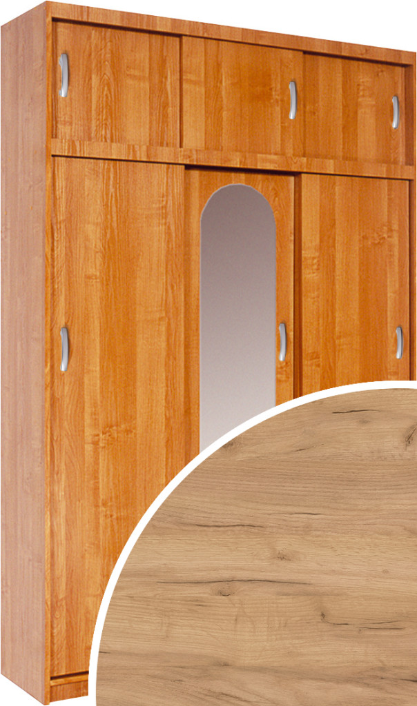 3-ajtós akasztós polcos fiókos gardróbszekrény tolóajtóval magasítóval és tükörrel