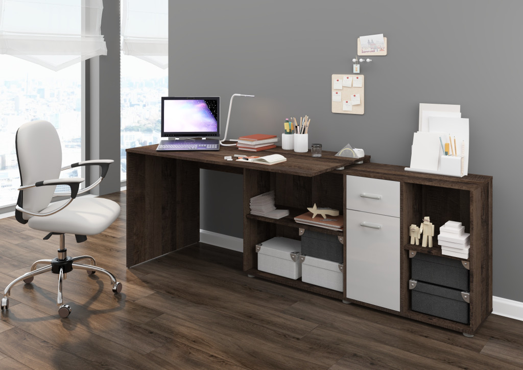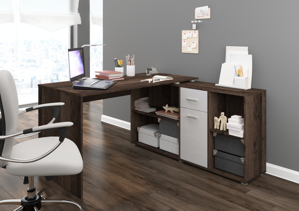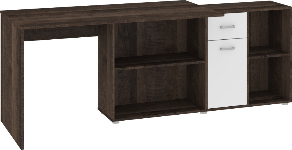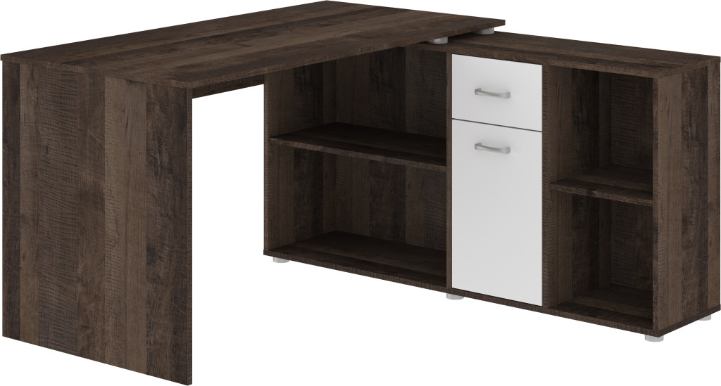 Sarok és egyenes állásban is összeszerelhető univerzális íróasztal kombináció fiókkal ajtóval polcokkal, jobbos