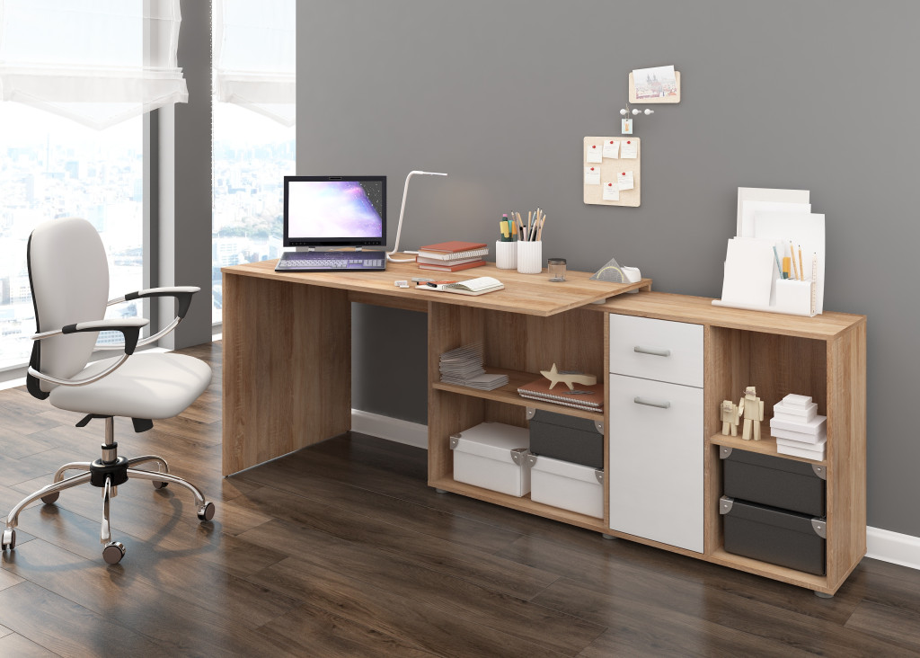 Sarok és egyenes állásban is összeszerelhető univerzális íróasztal kombináció fiókkal ajtóval polcokkal, jobbos
