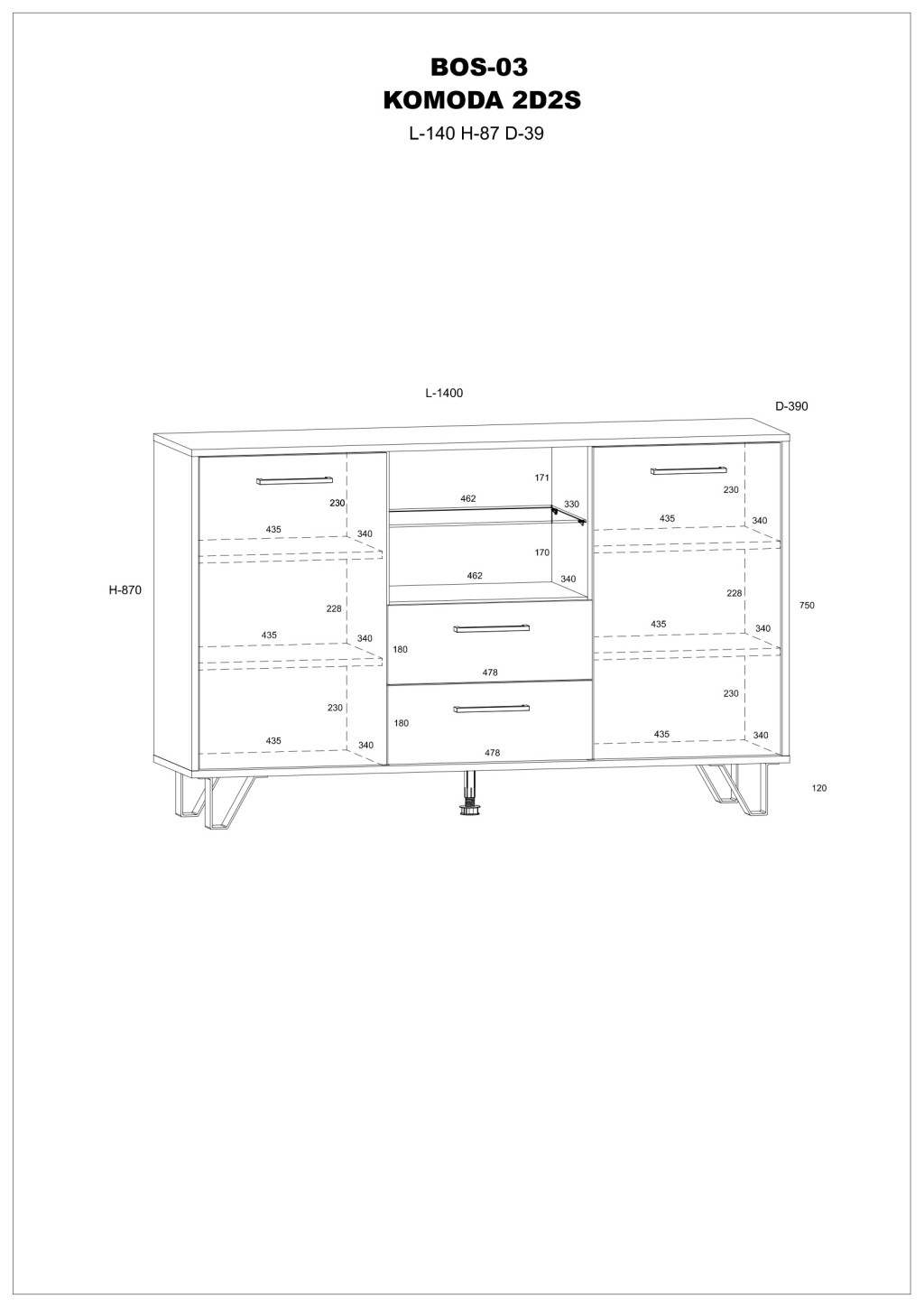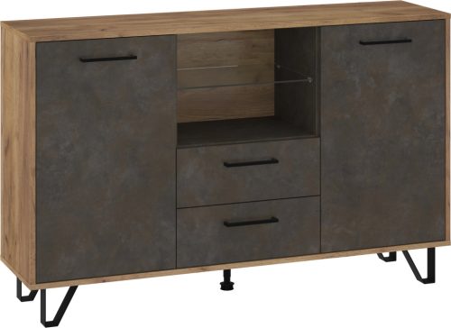 Komód 2 ajtóval 2 fiókkal polcokkal és nyitott üvegpolccal