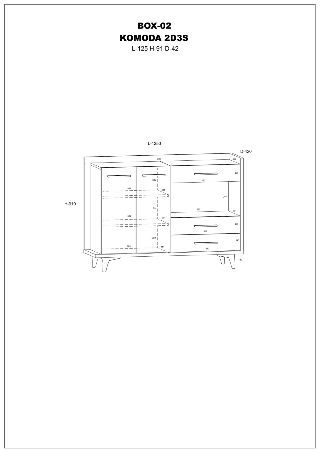 A bútor teljes súlya csomagolva: 52,5 kg. Lapraszerelten, csomagolva szállítjuk. Összeszerelési útmutató a dobozban. Dobozok száma: 3 db