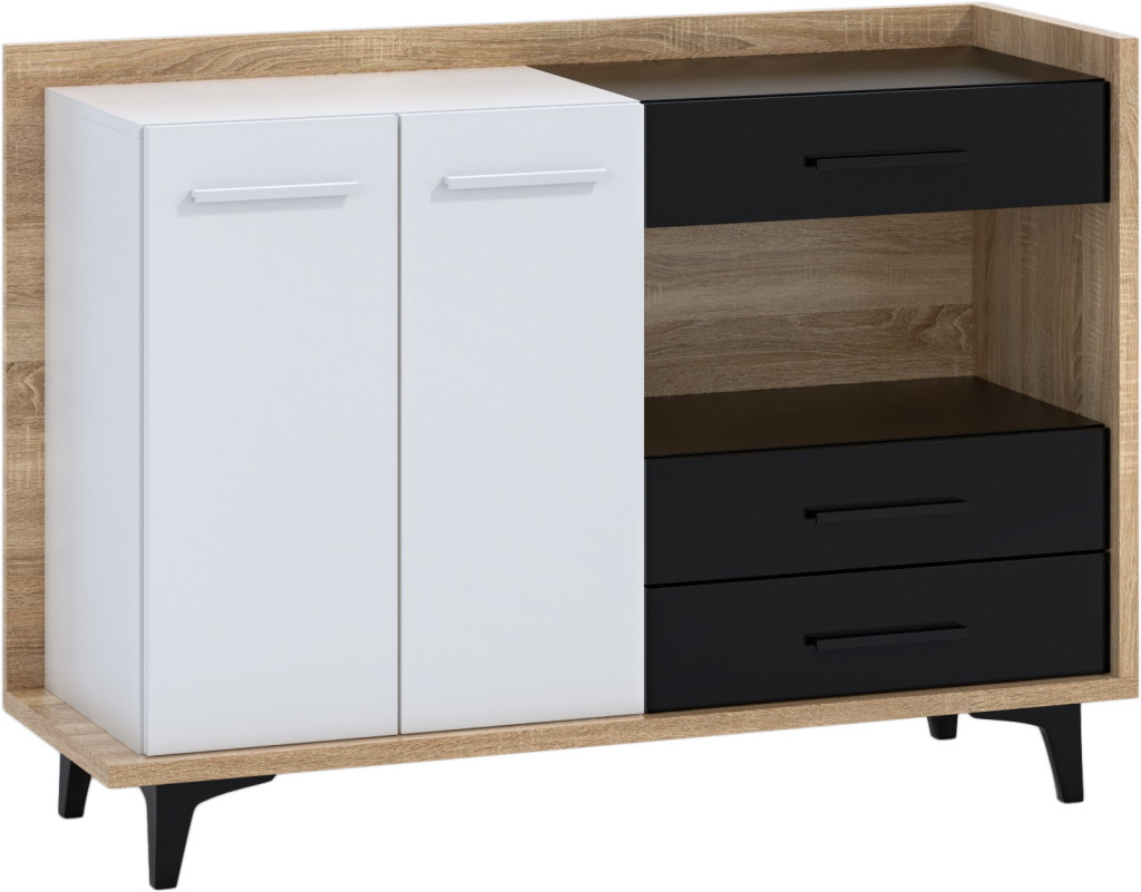 Box komód 2 ajtó 3 fiók - Világos Sonoma tölgy - Fehér - Fekete