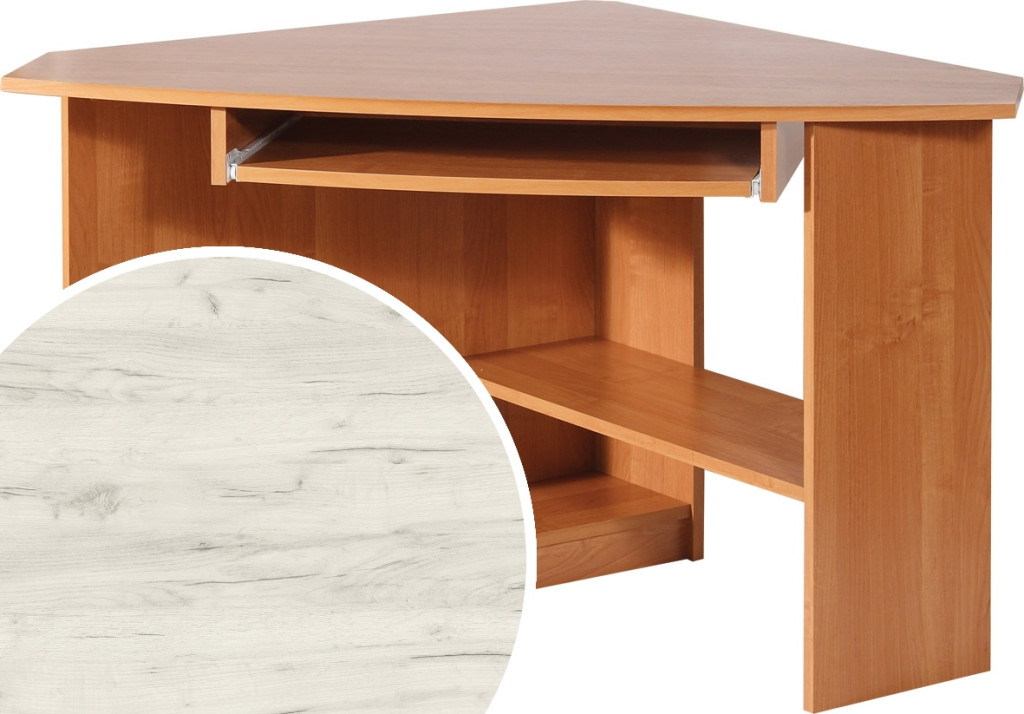 Sarok számítógépasztal billentyűzattartóval polccal és számítógépház tartóval, jobbos
