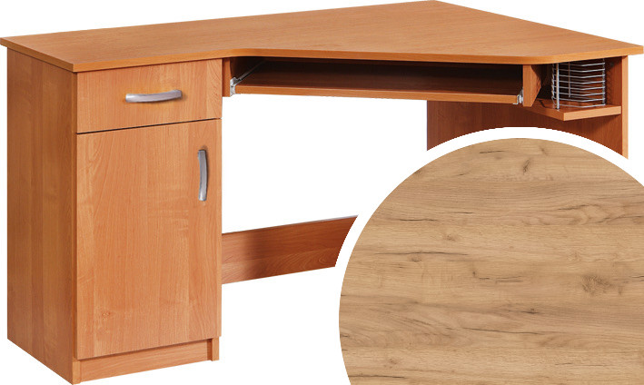 Sarok számítógépasztal ajtóval fiókkal billentyűzettartóval polccal és számítógép tartóval, balos