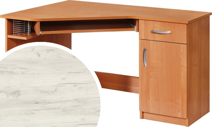Sarok számítógépasztal ajtóval fiókkal billentyűzettartóval polccal és számítógép tartóval, jobbos