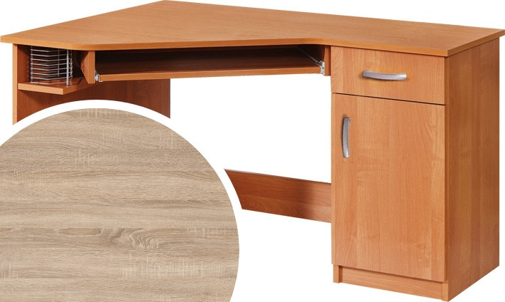 Sarok számítógépasztal ajtóval fiókkal billentyűzettartóval polccal és számítógép tartóval, jobbos