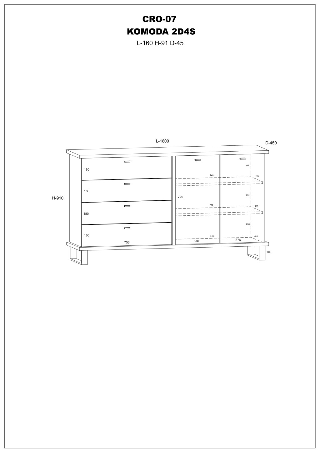 Komód 2 ajtóval 4 fiókkal az ajtó mögött polcokkal