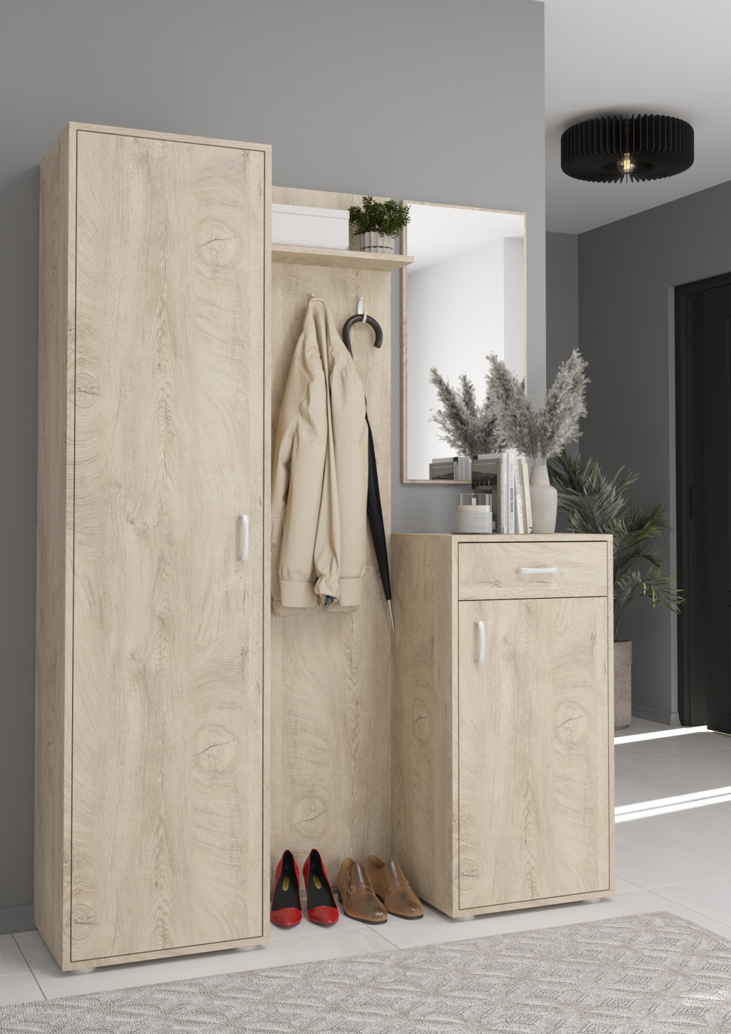 Komplett előszoba bútor szett, magas egyajtós felül egy polcos vállfatartós szekrénnyel, 1-ajtós 1-fiókos komóddal, akasztós előszobafallal és tükörrel