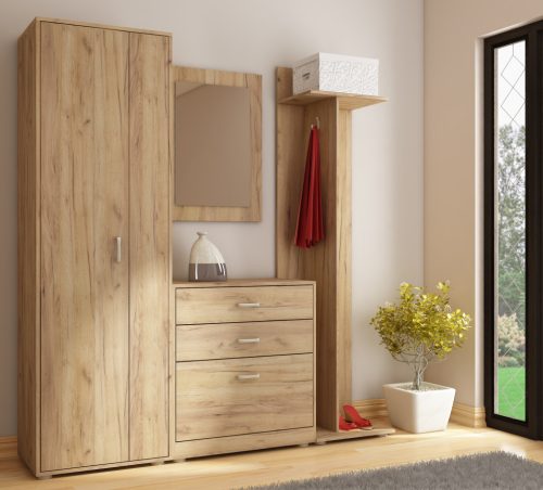 Komplett előszoba bútor szett, magas kétajtós felül egy polcos vállfatartós szekrénnyel, 1-ajtós 2-fiókos lenyílós cipőtartó komóddal, akasztós előszobafallal, kalaptartó polccal és tükörrel
