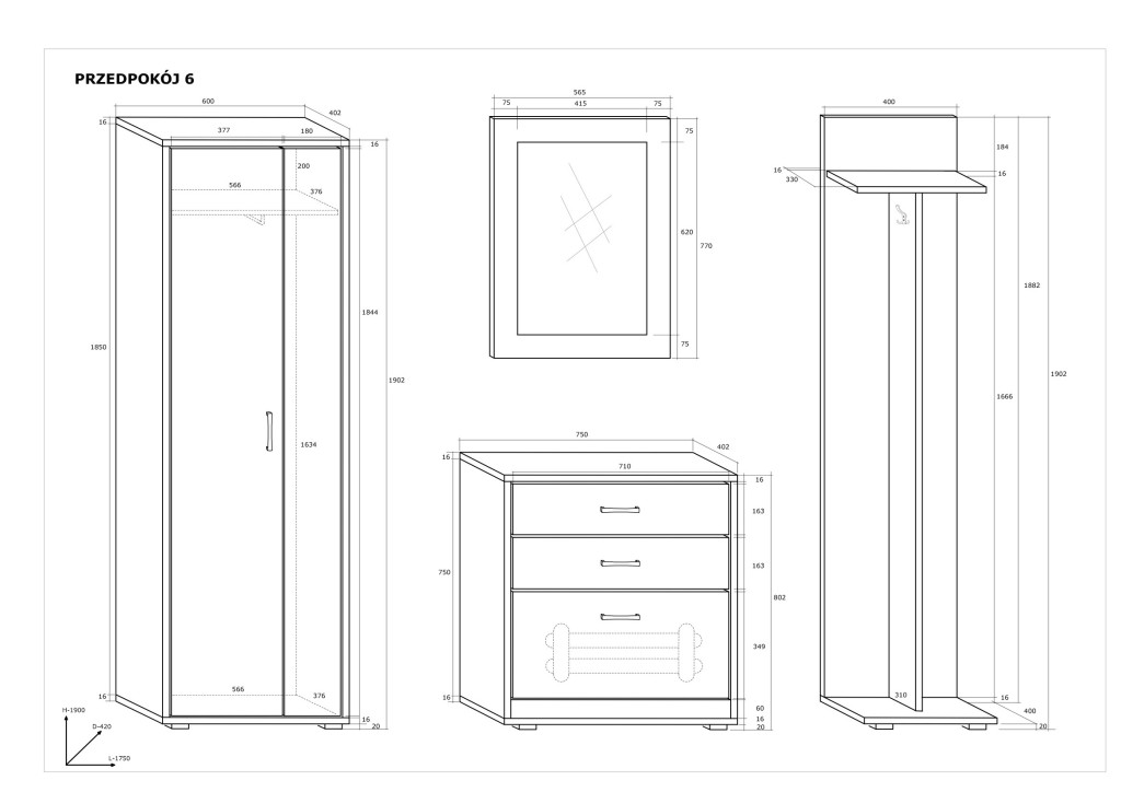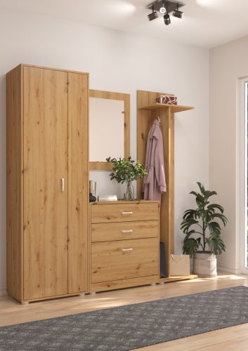Komplett előszoba bútor szett, magas kétajtós felül egy polcos vállfatartós szekrénnyel, 1-ajtós 2-fiókos lenyílós cipőtartó komóddal, akasztós előszobafallal, kalaptartó polccal és tükörrel