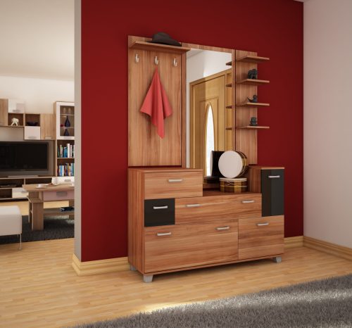 Előszobafal tükörrel fiókokkal cipőtartó szekrényekkel fogasokkal nyitott polcokkal