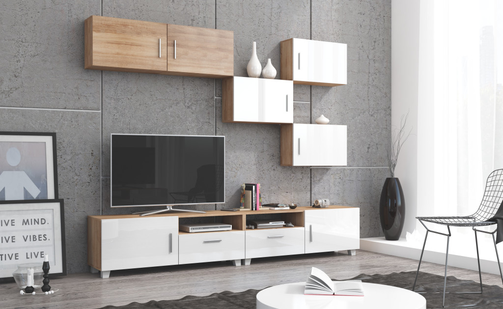 TV-állvány 2 ajtóval 2 fiókkal nyitott polcokkal ajtós fali szekrényekkel