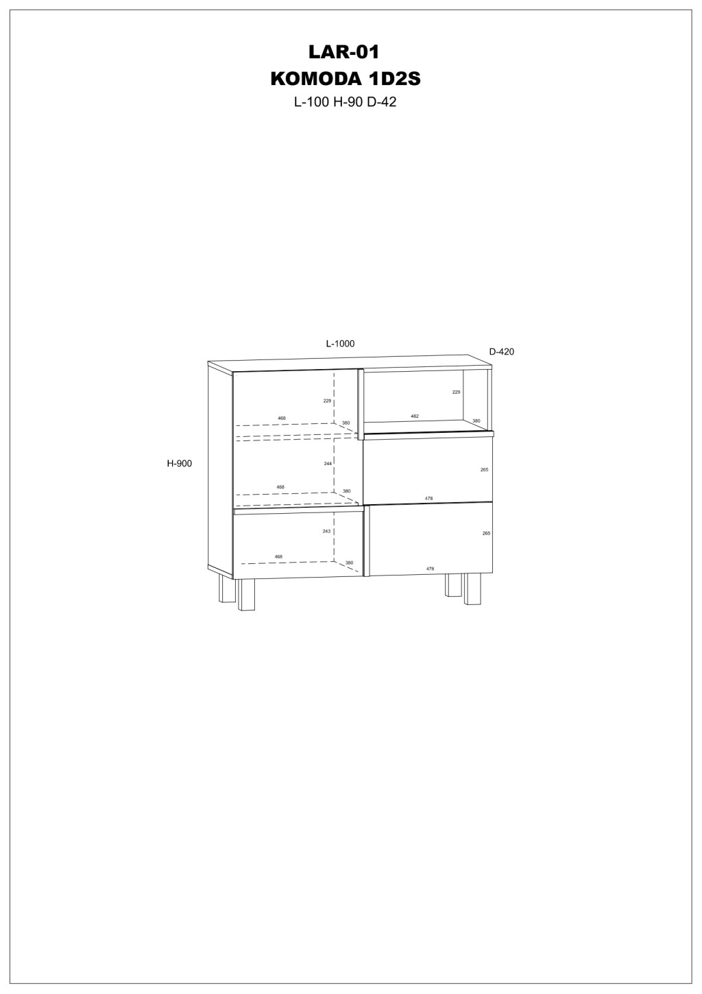 Komód 1 ajtóval 2 fiókkal az ajtó mögött polccal és nyitott polccal