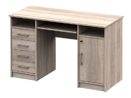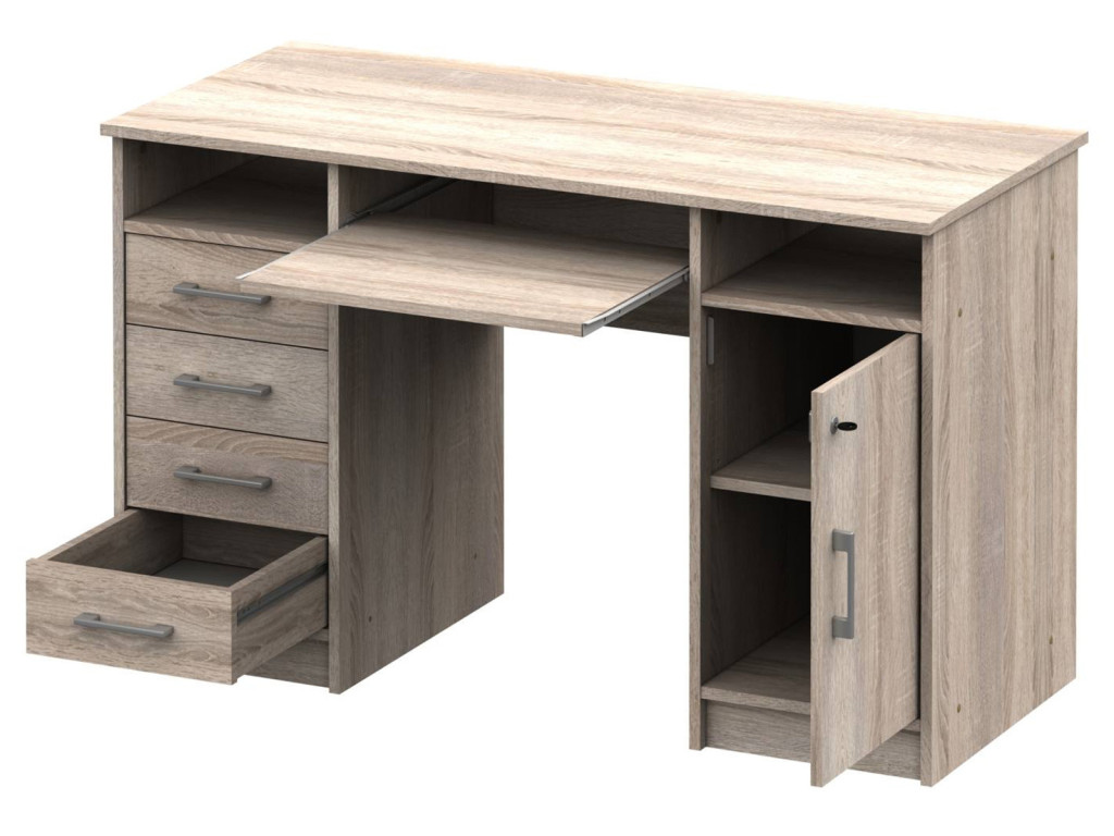 4 fiókos, 1 ajtós kialakítású íróasztal, polccal, billentyűzettartóval.