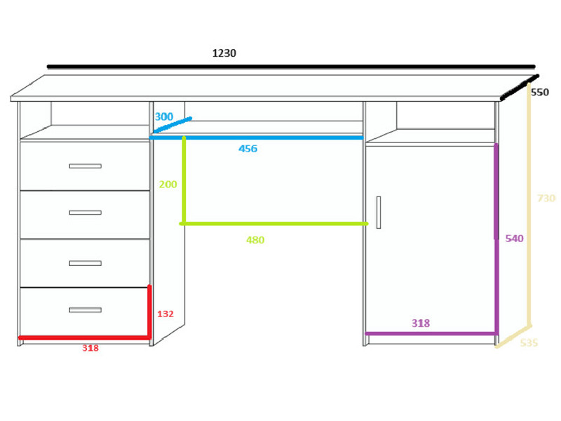 4 fiókos, 1 ajtós kialakítású íróasztal, polccal, billentyűzettartóval.