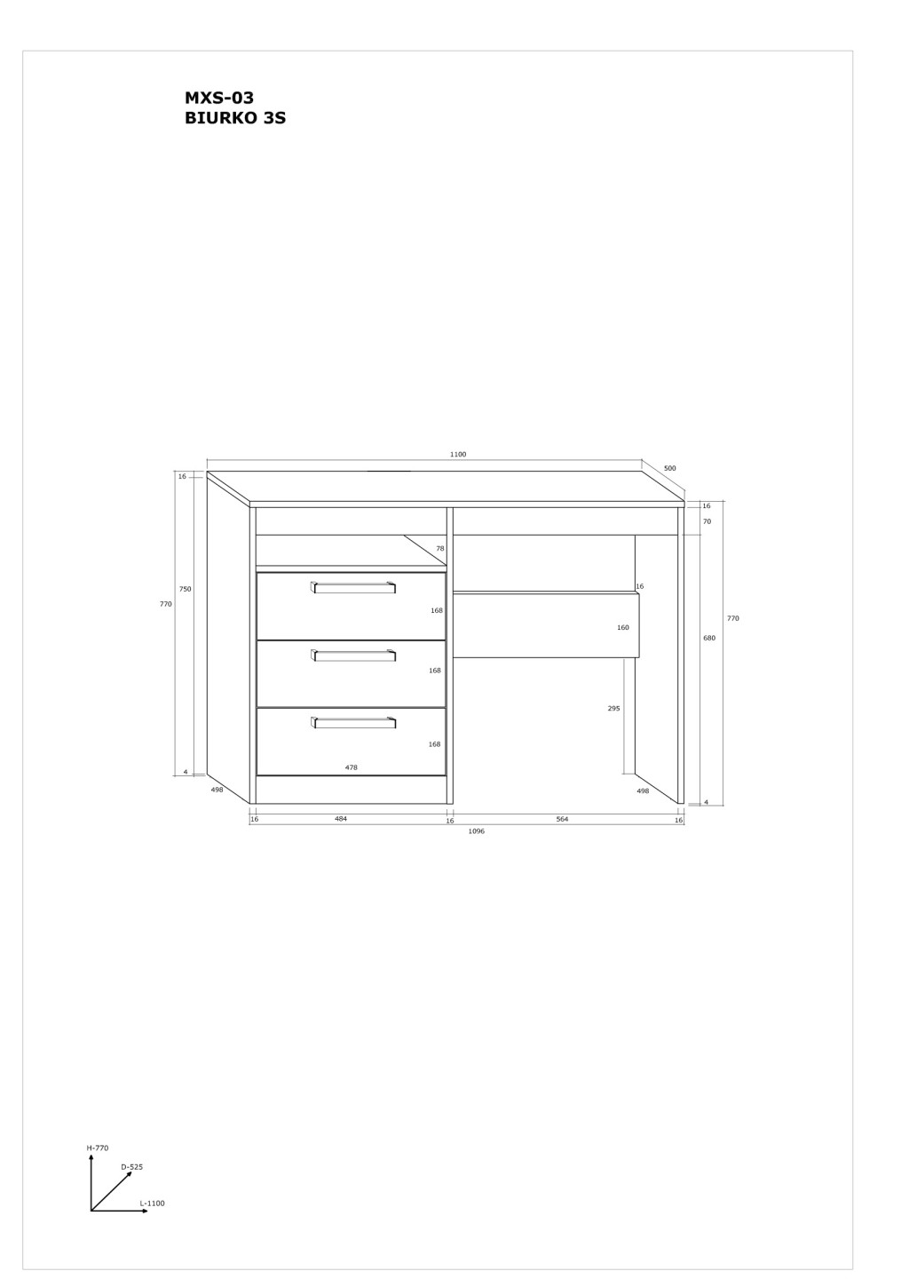 Íróasztal 3 fiókkal és nyitott polccal