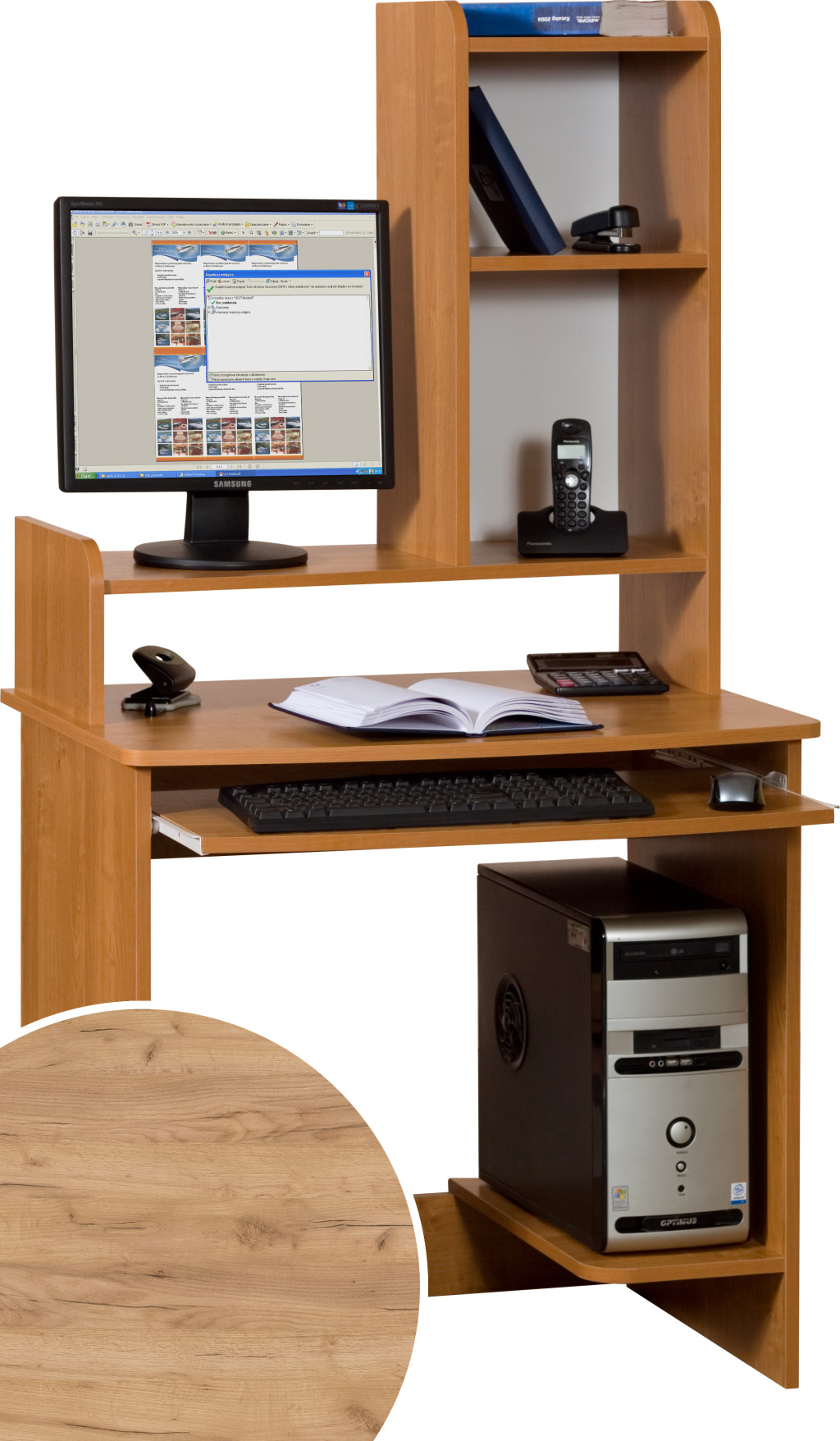 Számítógépasztal billentyűzettartóval számítógép tartóval az asztalon polcos magasítóval és monitortartóval