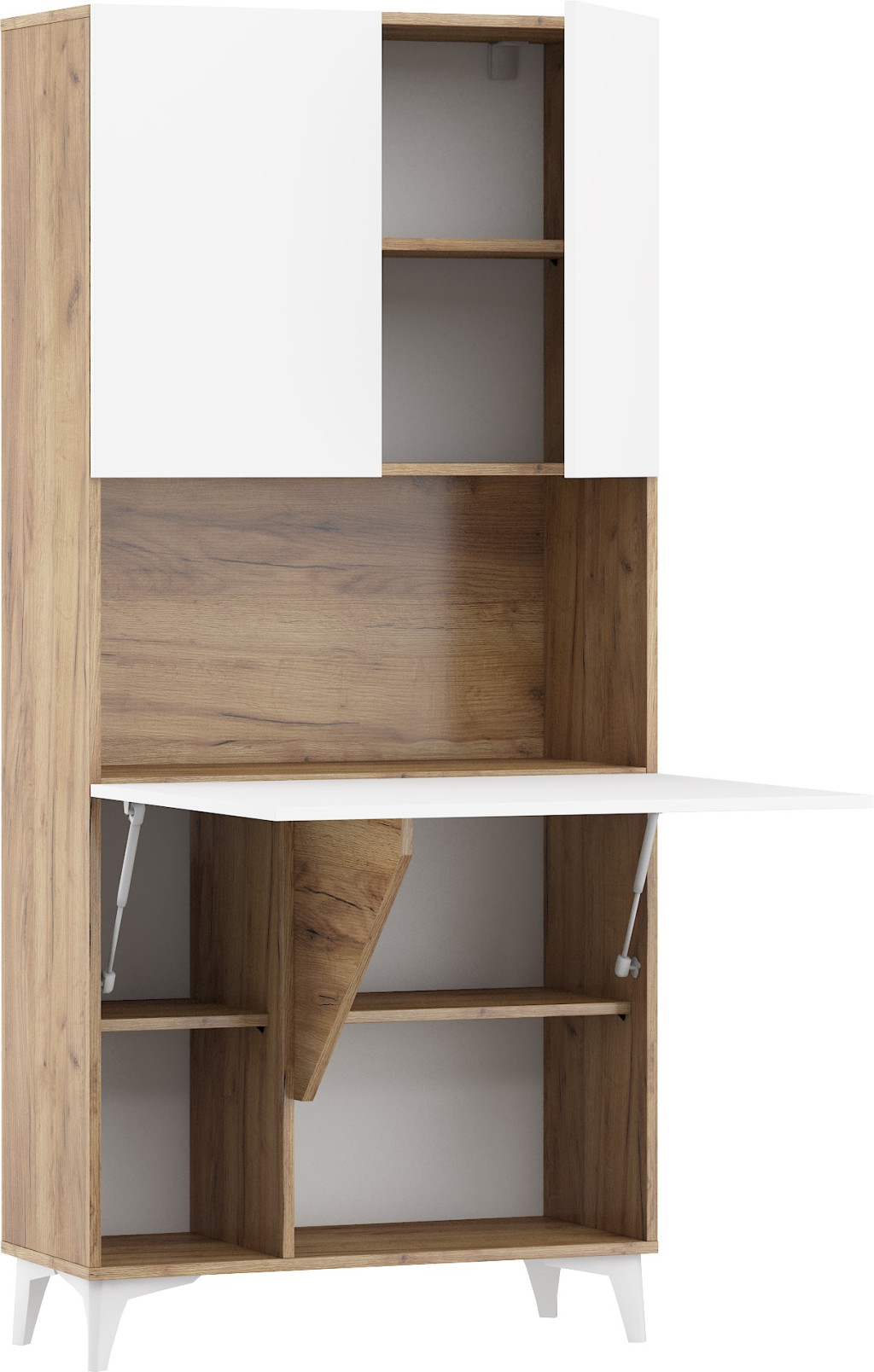 Többfunkciós 3-ajtós szekrény polcokkal, az alsó ajtó felhajtható és íróasztalként vagy kétszemélyes étkezőasztalként is használható