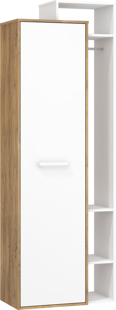 Gardróbszekrény 1 ajtóval az ajtó mögött alul-felül 1-1 polccal vállfatartóval és nyitott polcokkal, jobbos