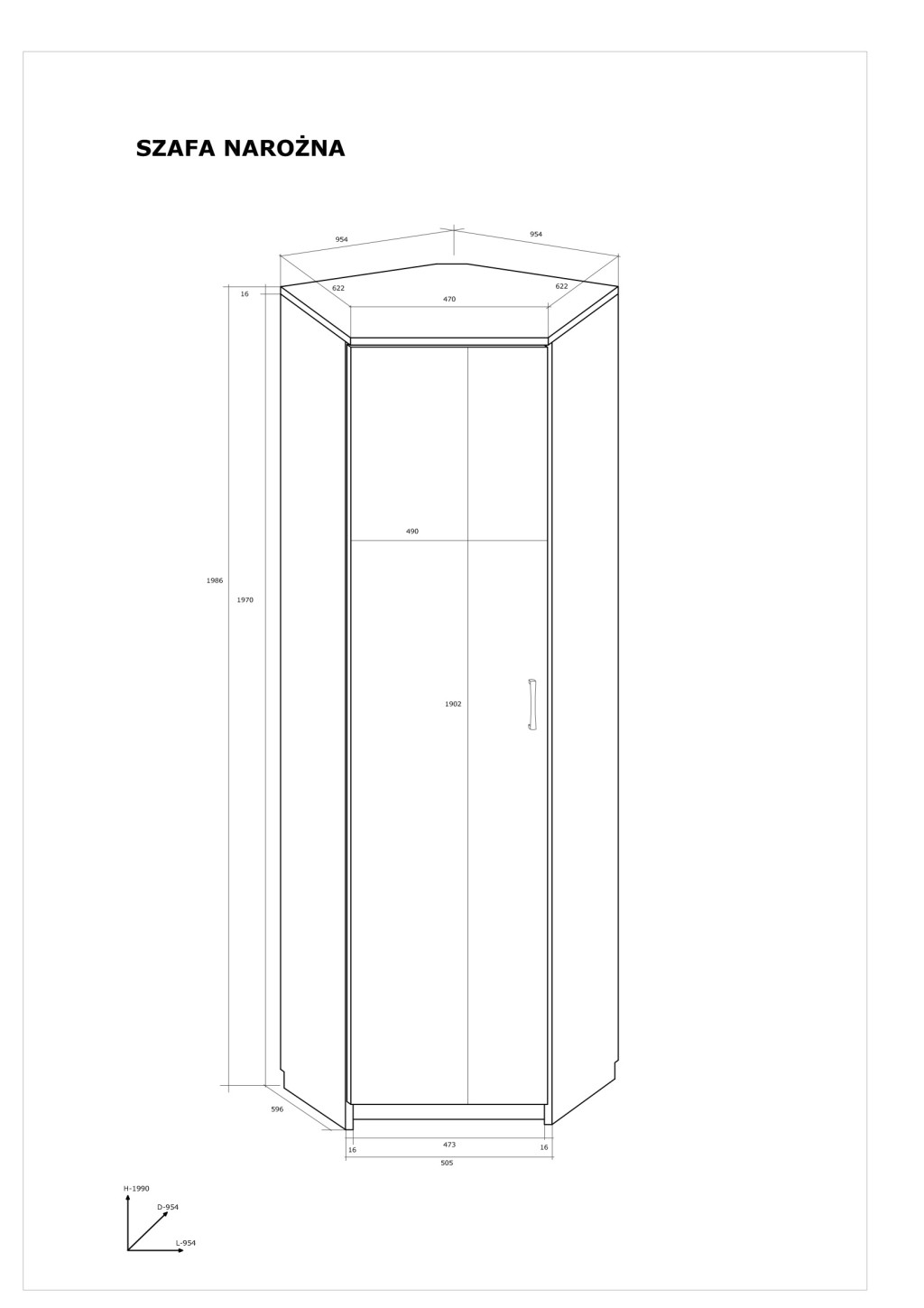 Sarok gardróbszekrény polcos-akasztós belsővel akasztórúddal és az ajtón tükörrel