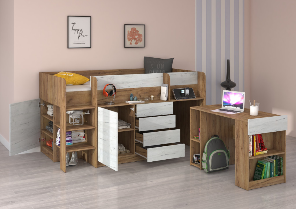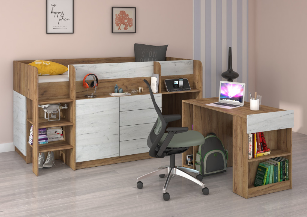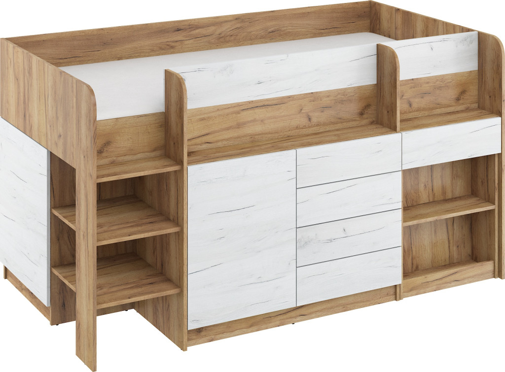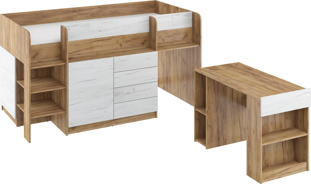 Alacsony galériaágy lépcsővel szekrényekkel nyitott polcokkal kihúzható íróasztallal fiókokkal, matrac nélkül, balos