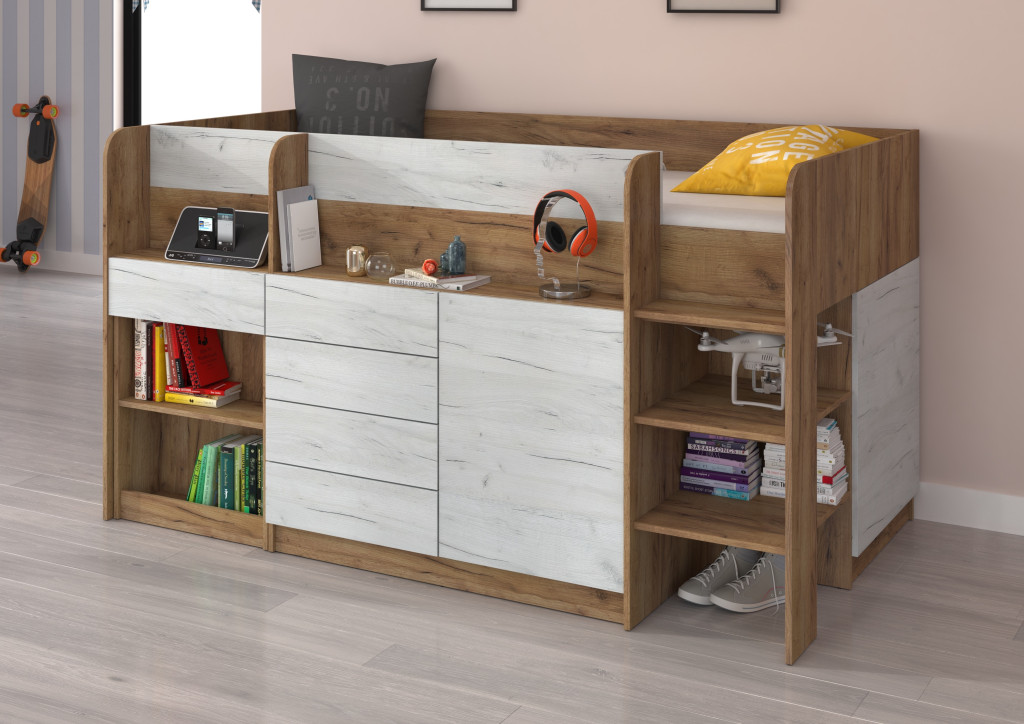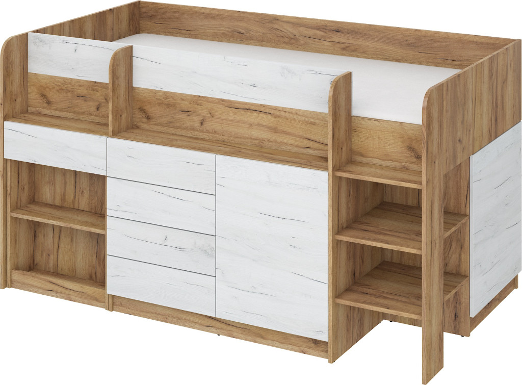 Alacsony galériaágy lépcsővel szekrényekkel nyitott polcokkal kihúzható íróasztallal fiókokkal, matrac nélkül, jobbos