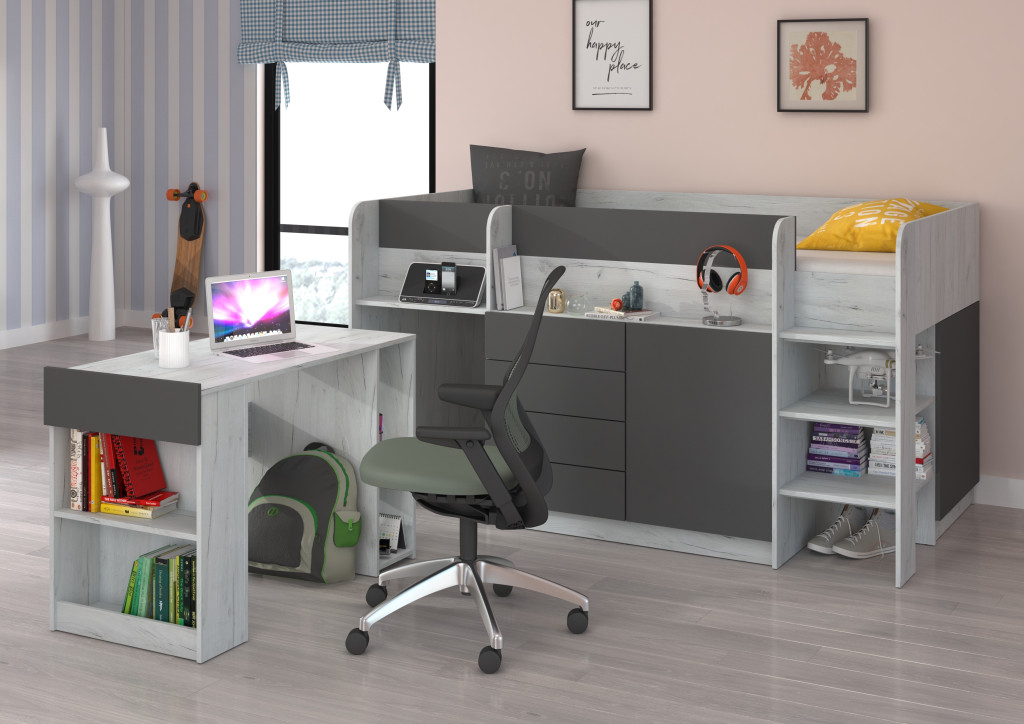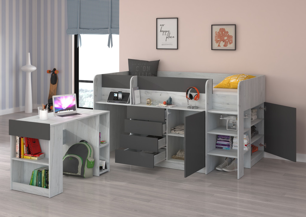 Alacsony galériaágy lépcsővel szekrényekkel nyitott polcokkal kihúzható íróasztallal fiókokkal, matrac nélkül, jobbos