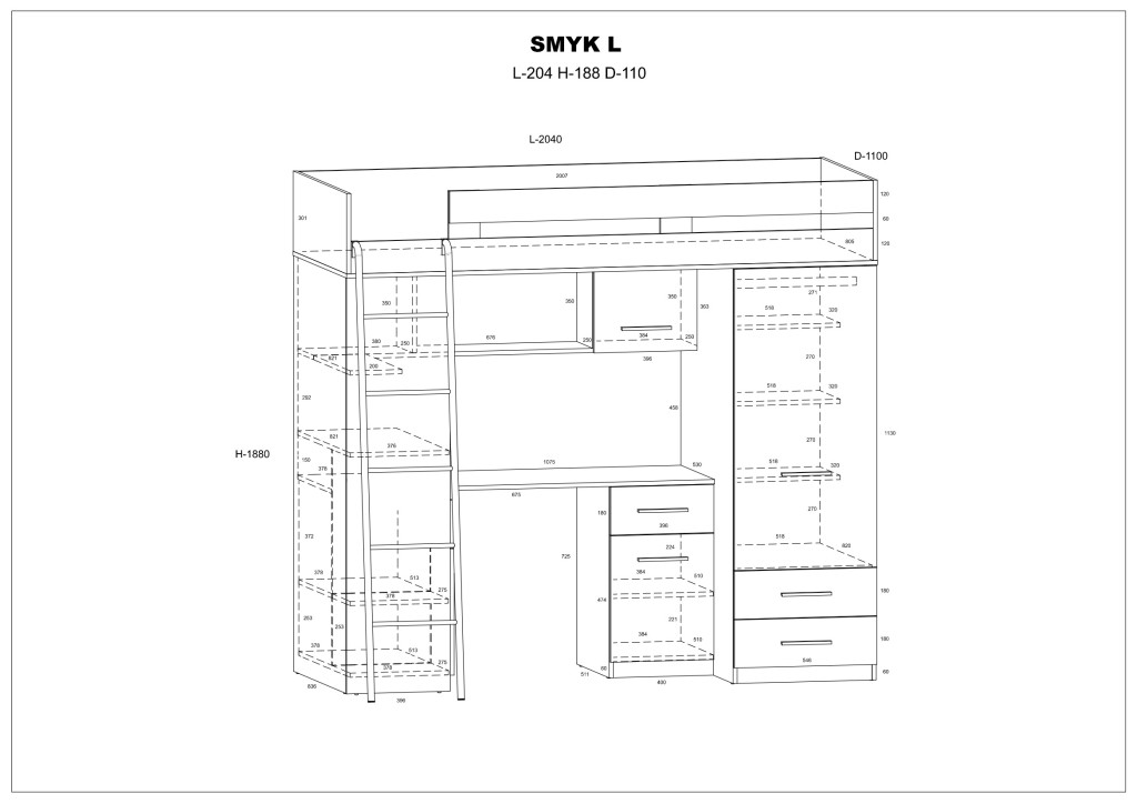 Galériaágy létrával korláttal szekrényekkel író- és számítógépasztallal polcokkal fiókokkal és tükörrel, matrac nélkül, balos