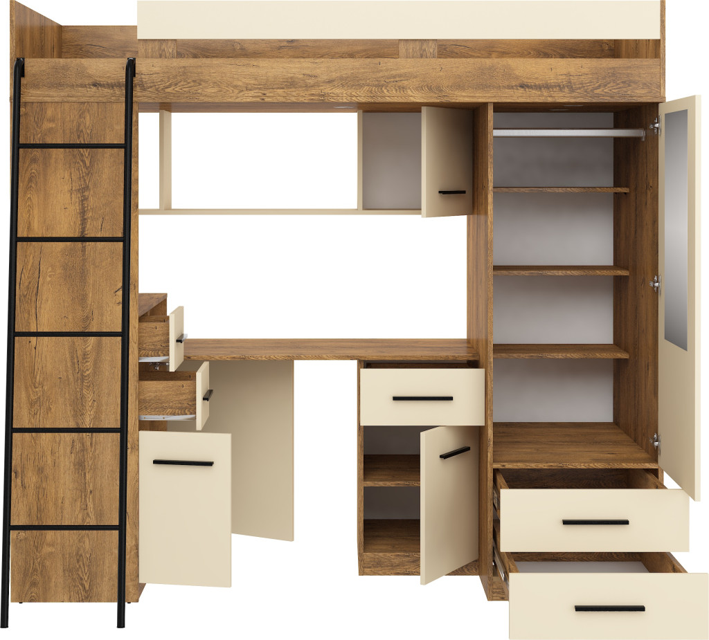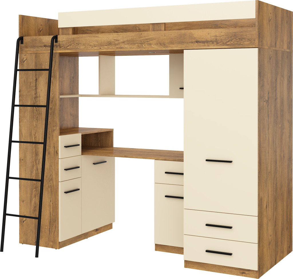 Galériaágy létrával korláttal szekrényekkel író- és számítógépasztallal polcokkal fiókokkal és tükörrel, matrac nélkül, balos