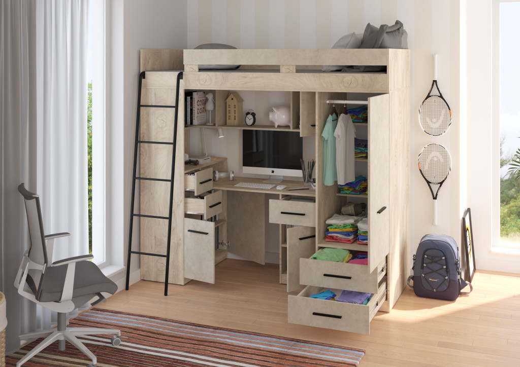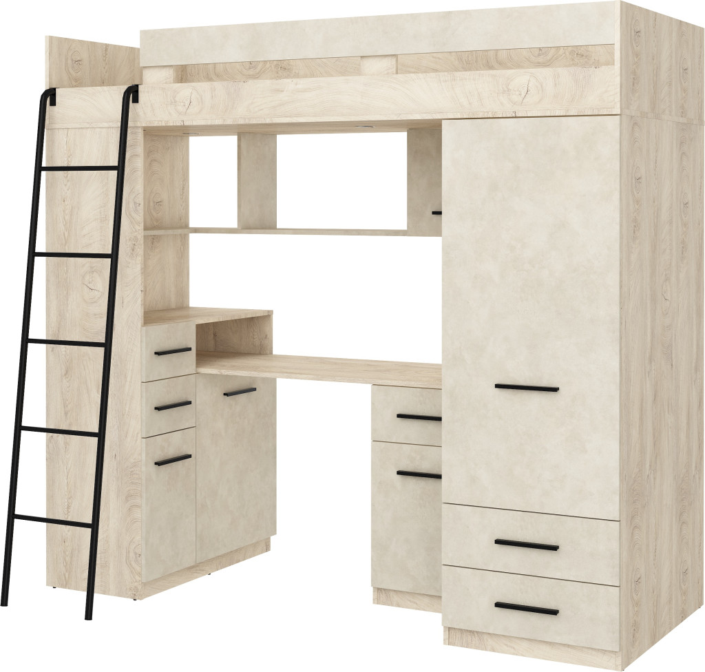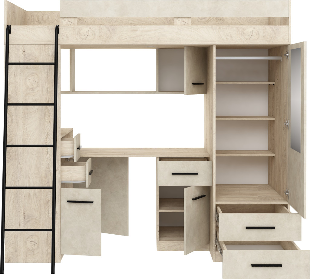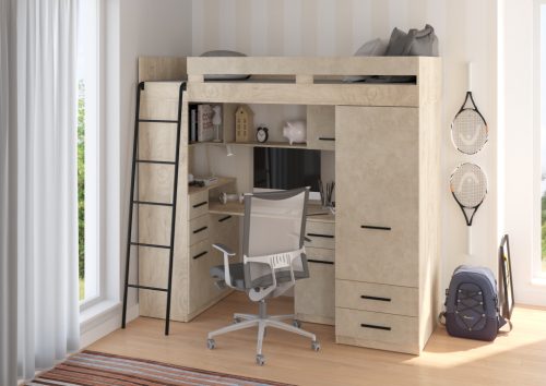 Galériaágy létrával korláttal szekrényekkel író- és számítógépasztallal polcokkal fiókokkal és tükörrel, matrac nélkül, balos