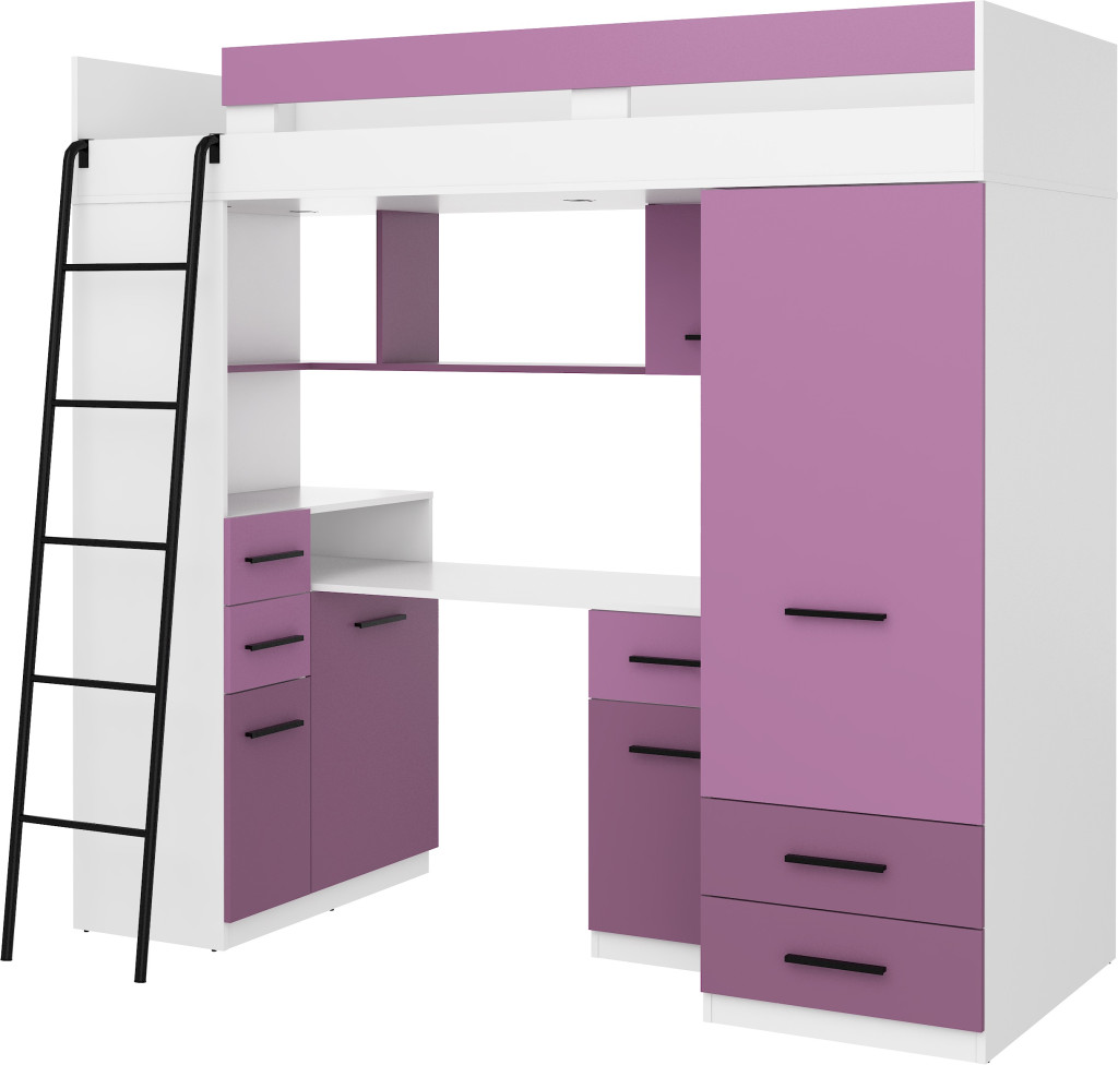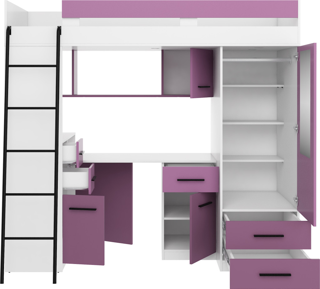Galériaágy létrával korláttal szekrényekkel író- és számítógépasztallal polcokkal fiókokkal és tükörrel, matrac nélkül, balos