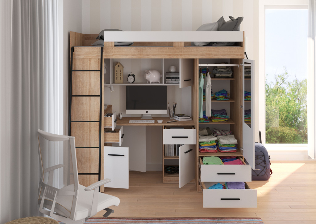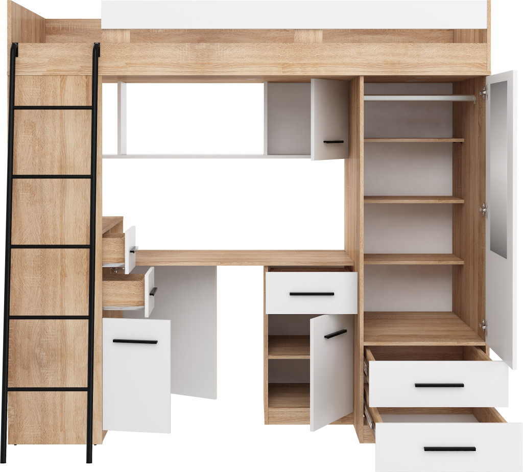 Galériaágy létrával korláttal szekrényekkel író- és számítógépasztallal polcokkal fiókokkal és tükörrel, matrac nélkül, balos