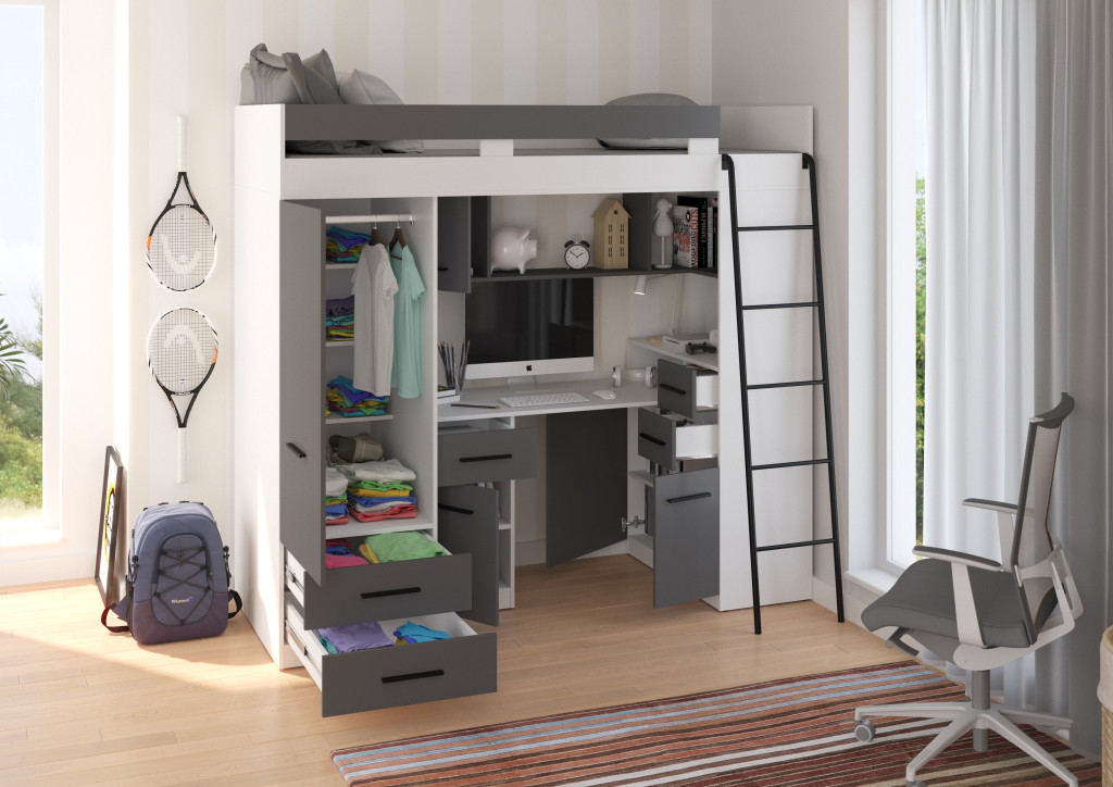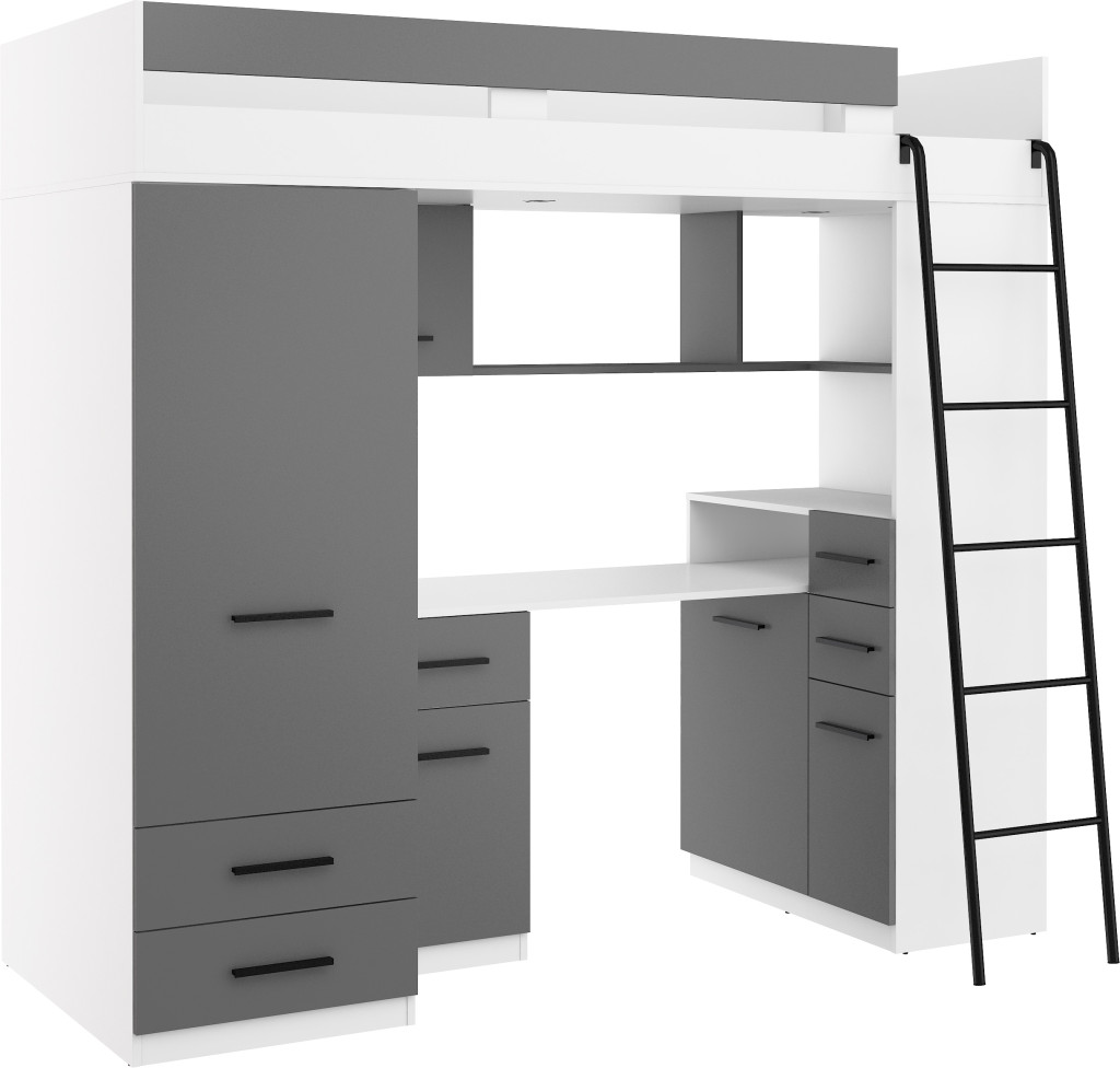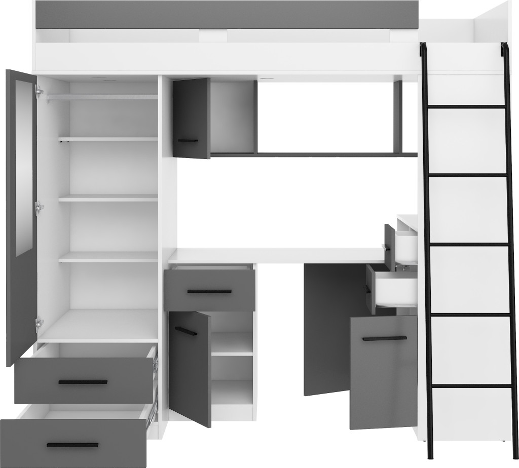 Galériaágy létrával korláttal szekrényekkel író- és számítógépasztallal polcokkal fiókokkal és tükörrel, matrac nélkül, jobbos