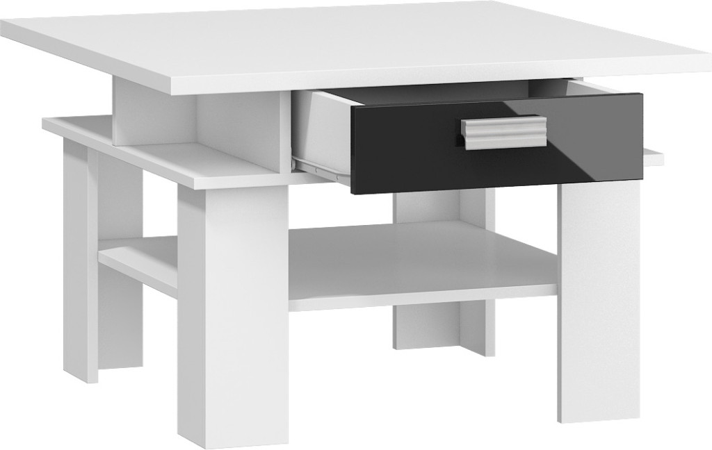 Dohányzóasztal 2 fiókkal nyitott polcokkal és négyzet alakú szögletes asztallappal