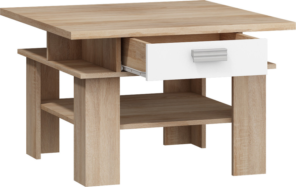Dohányzóasztal 2 fiókkal nyitott polcokkal és négyzet alakú szögletes asztallappal