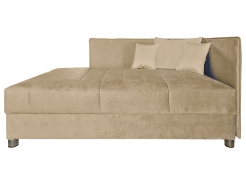 Jobbos állású, rugós fekvőfelületű heverő, ágyneműtartóval, díszpárnákkal, fej- és háttámlával.