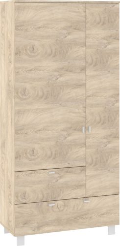 Gardróbszekrény 2 ajtóval alul 2 fiókkal az ajtók mögött egyik oldalon felül 1 polccal és vállfatartóval másik oldalon végig polcokkal