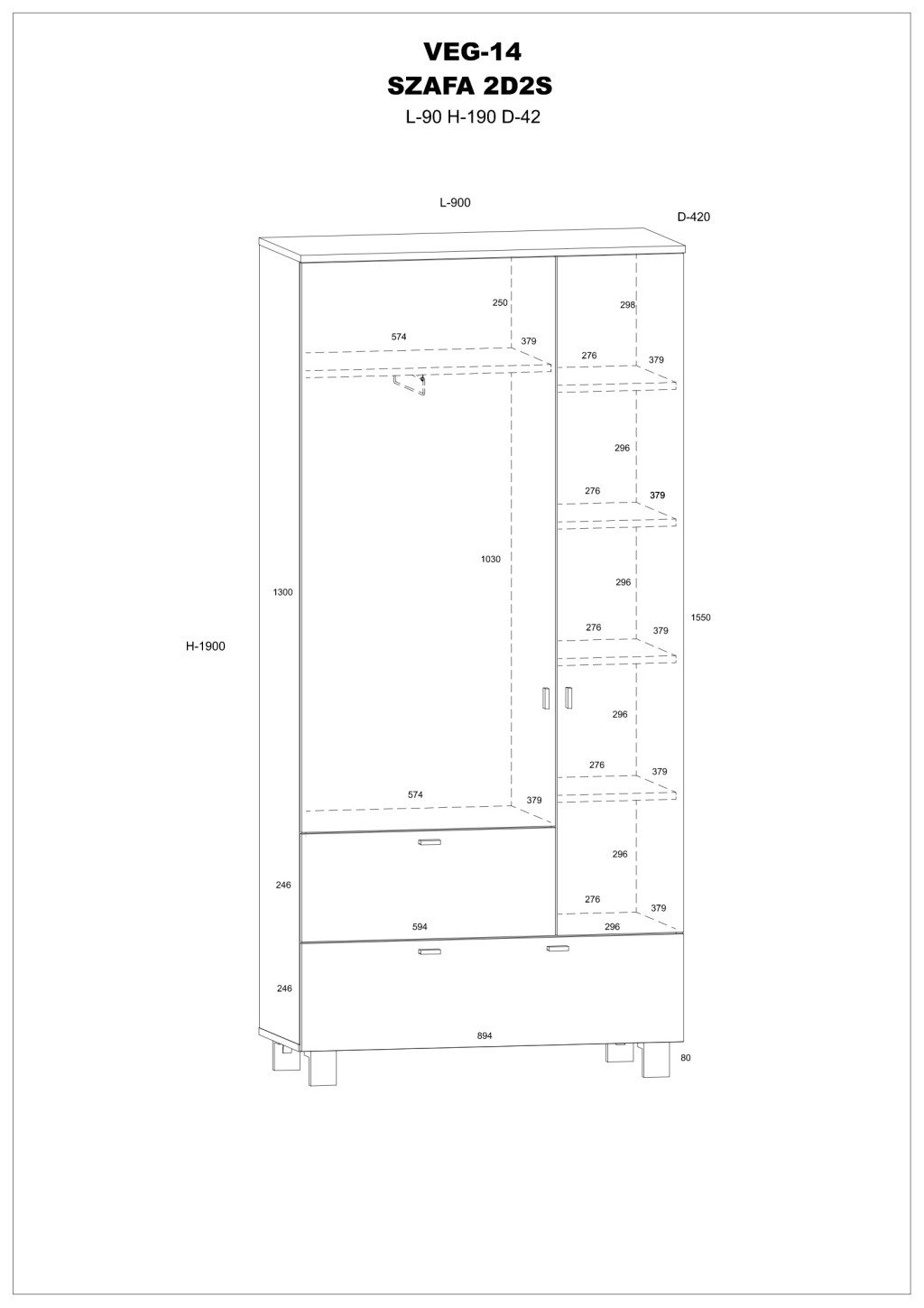 Gardróbszekrény 2 ajtóval alul 2 fiókkal az ajtók mögött egyik oldalon felül 1 polccal és vállfatartóval másik oldalon végig polcokkal