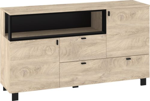 Komód 2 normál és alul 1 lenyíló ajtóval 1 fiókkal az ajtók mögött polcokkal és nyitott polccal