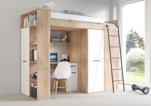 Galériaágy létrával korláttal akasztós és polcos szekrényekkel fiókos-ajtós íróasztallal könyves polcokkal belső fiókokkal és tükörrel, matrac nélkül, jobbos