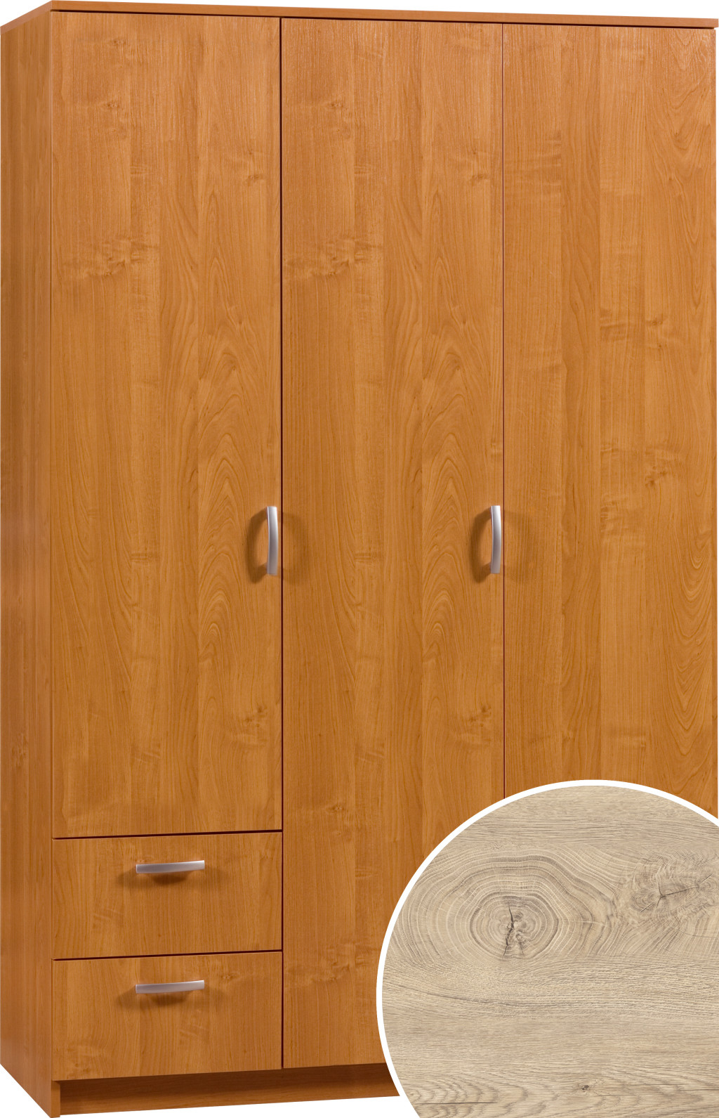 Gardróbszekrény 3 ajtóval és 2 fiókkal, 1 ajtó mögött végig polcokkal 2 ajtó mögött felül 1 polccal és vállfatartó rúddal, tükör nélkül