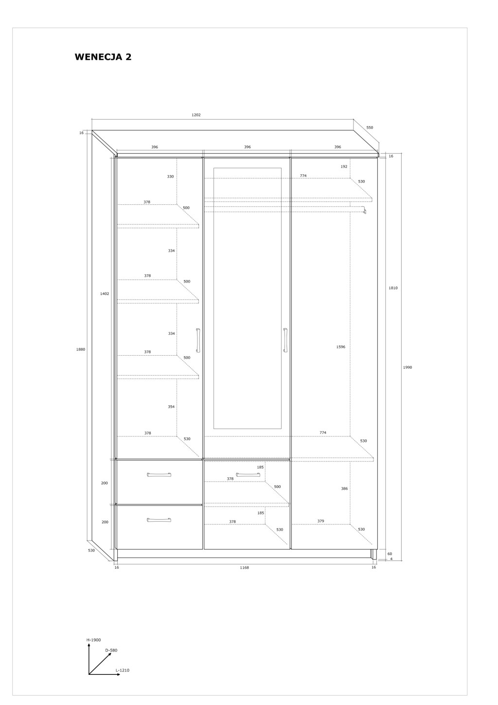 Gardróbszekrény 3 ajtóval 1 lenyíló ajtóval és 2 fiókkal, 1 ajtó mögött végig polcokkal 2 ajtó mögött felül 1 polccal és vállfatartó rúddal, a lenyíló kis ajtó mögött polcokkal, tükörrel
