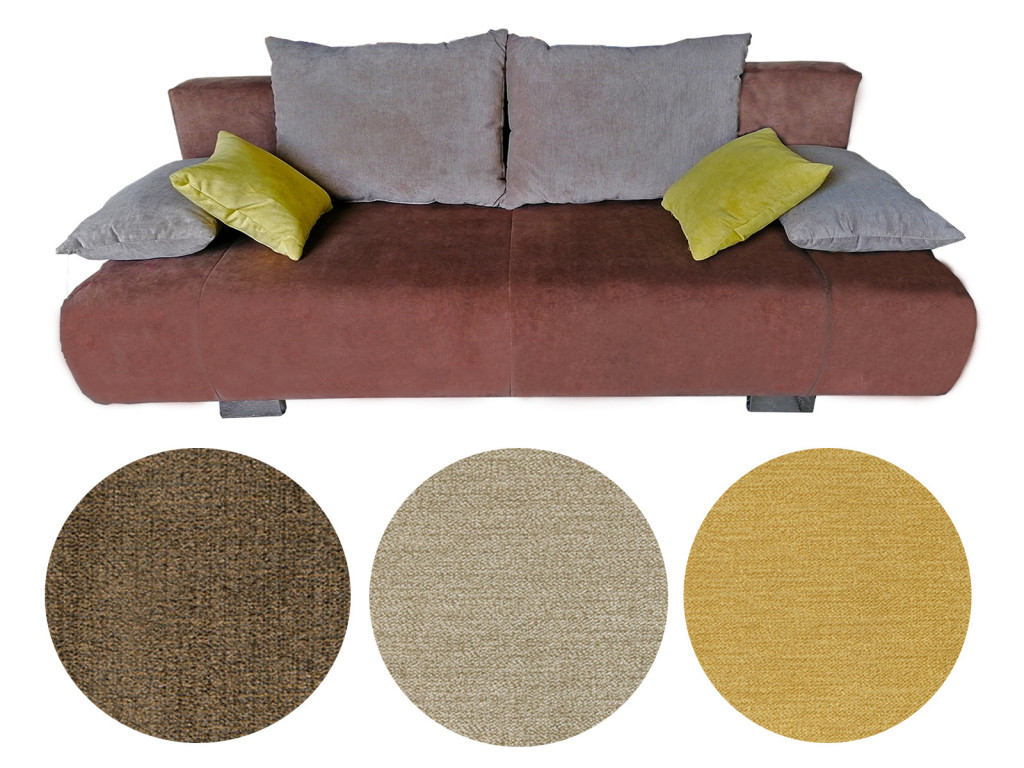 Puha szövet borítású, kétszemélyes ággyá nyitható kanapéágy, méretes ágyneműtartóval, karpárnákkal és díszpárnákkal.