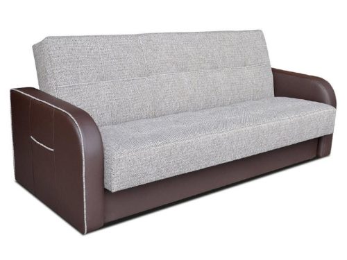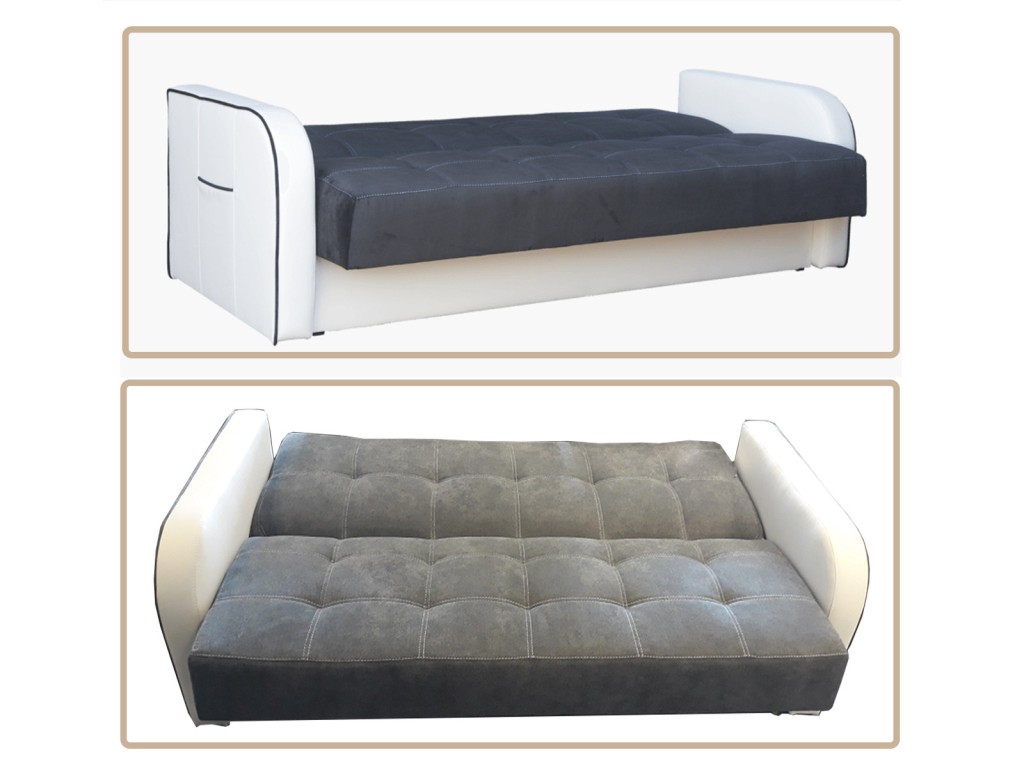 Kattanós nyitású kanapéágy, ágyneműtartóval, karfákkal, steppelt és tűzött ülőfelülettel és háttámlával.
